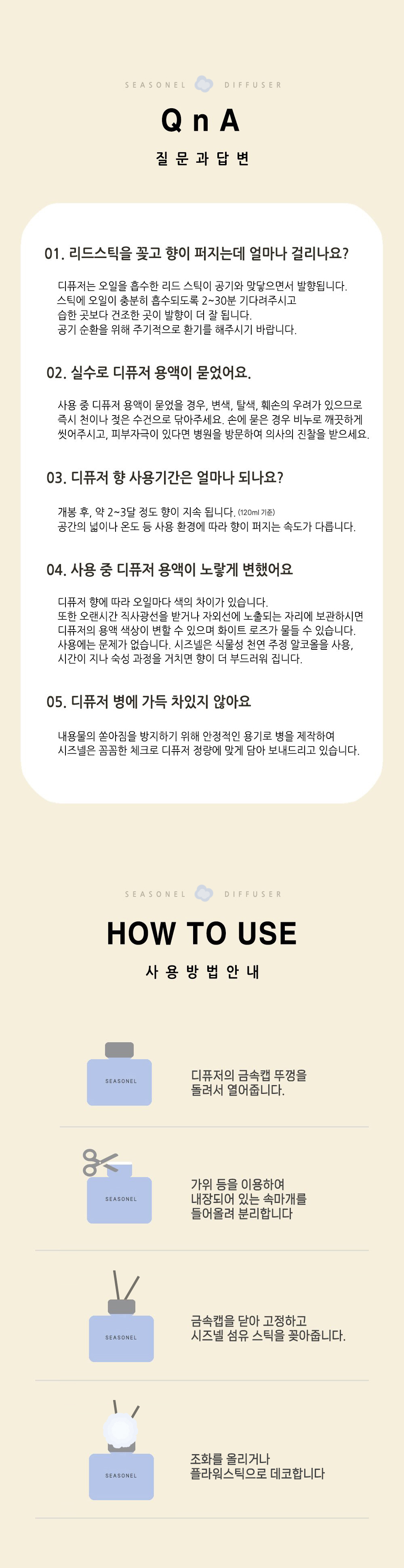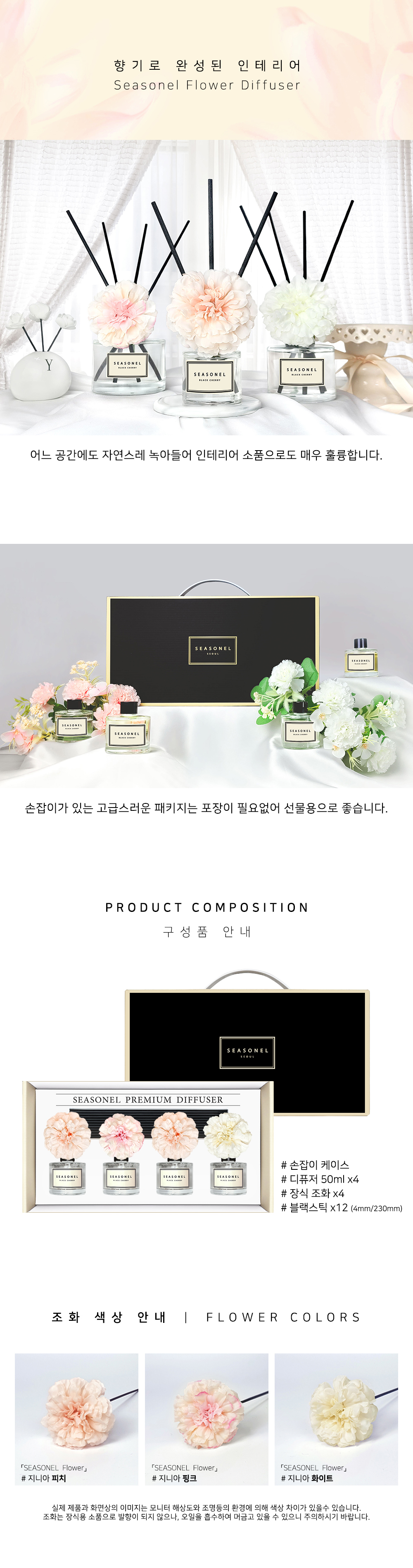 구성 | 50ml 디퓨져x4, 조화x4, 스틱 12개 | 제품규격 | 340*175*56 |